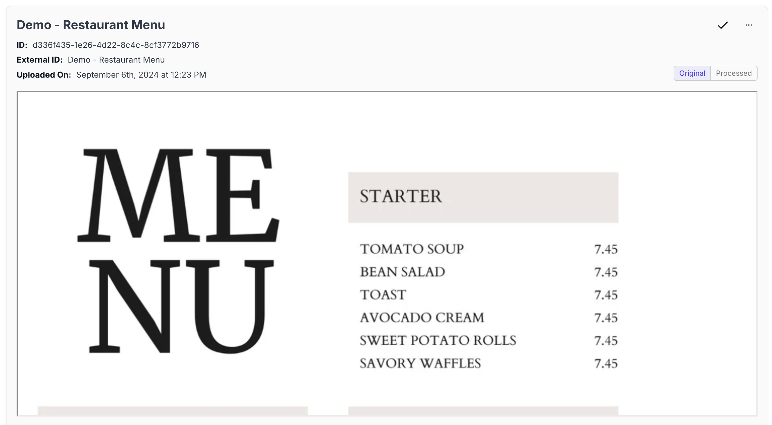 The Advanced Chunking strategy preserves the menu structure, recognizing section headers, item names, and prices while maintaining their relationships.